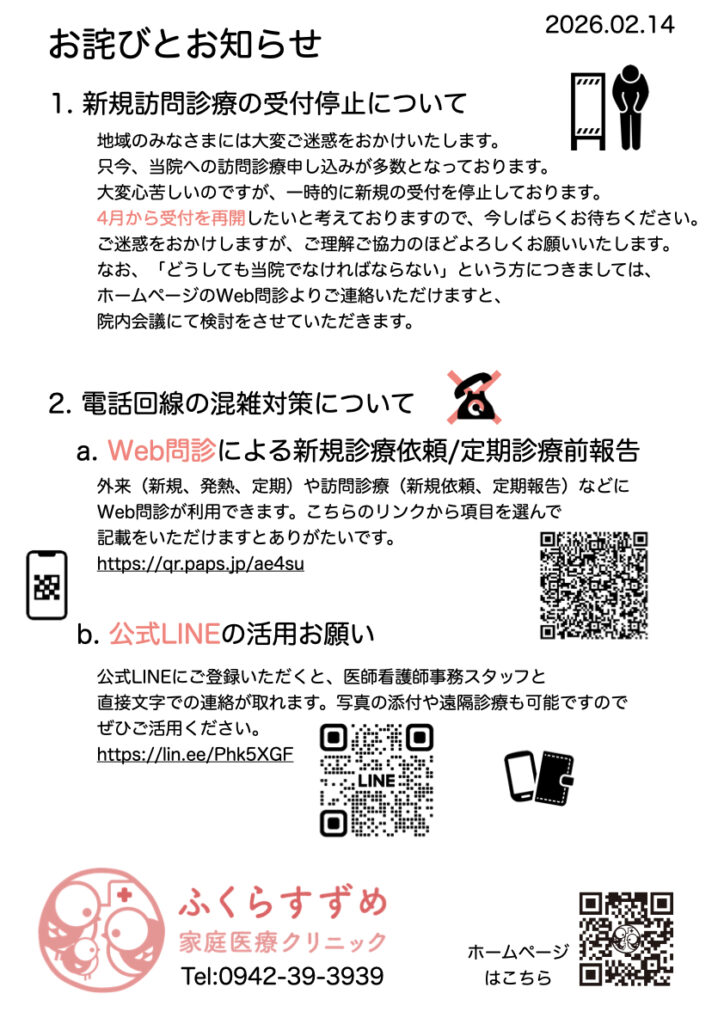 お詫びとお知らせ(新規訪問診療の一時的な受け入れ停止、および電話回線の混雑対策について)