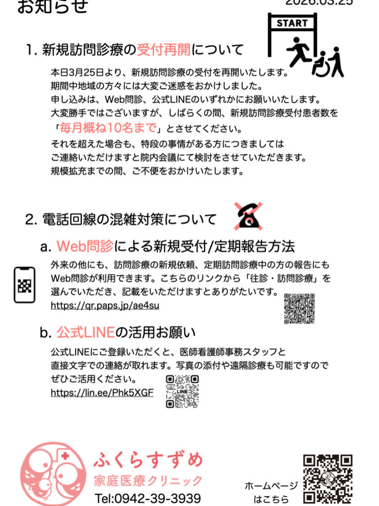 一時停止しておりました、新規訪問診療の受付を再開いたします。皆様にはご迷惑をおかけしました。まだ人数の制限はございますが、少しずつでも地域のお役に立てたらと思います。申し込みは、ホームページのお問い合わせ、Web問診、メール、公式LINEにてお願いいたします。